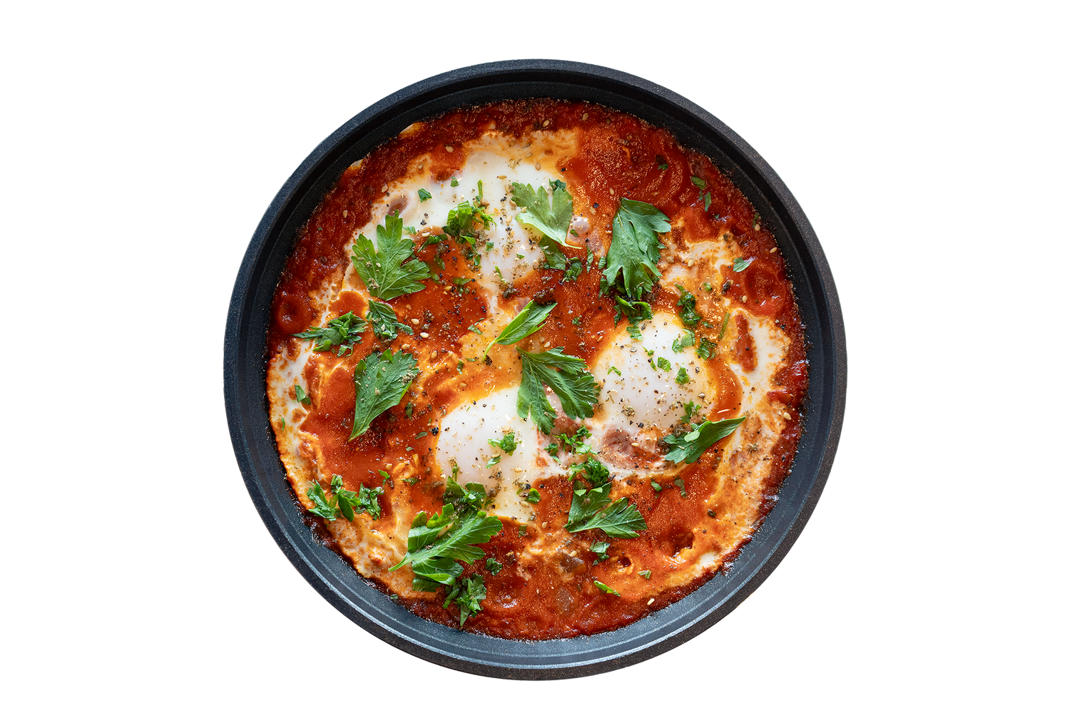A one pan dish consisting of eggs poached in a chunky tomato and bell pepper sauce. Usually served with crusty bread, this dish is known as a Mediterranean brunch staple.