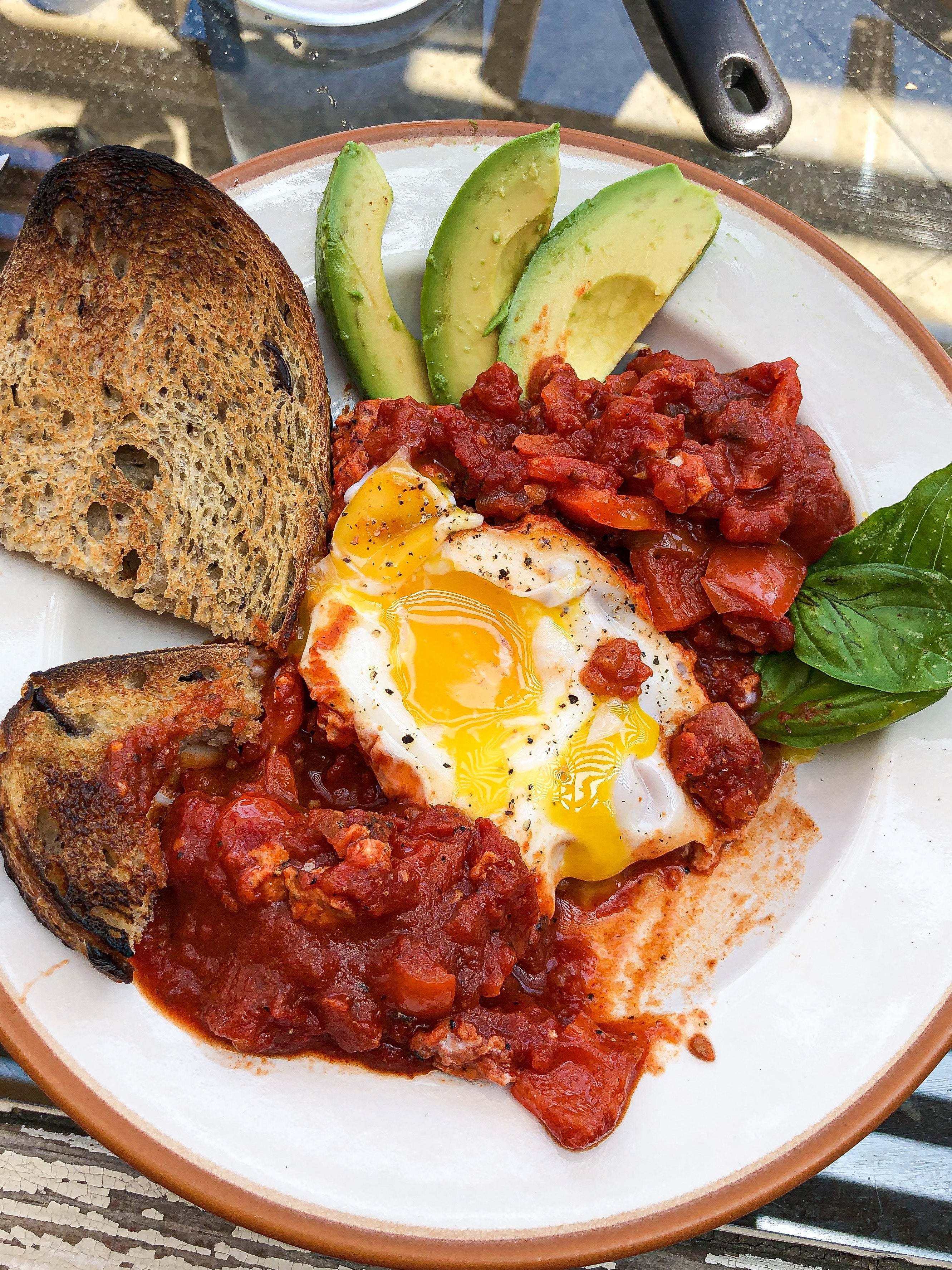 A one pan dish consisting of eggs poached in a chunky tomato and bell pepper sauce. Usually served with crusty bread, this dish is known as a Mediterranean brunch staple.
